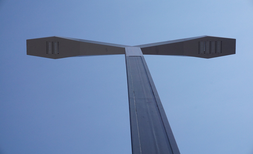 “科技之光“燈桿為多功能桿,雙臂設(shè)計,線條簡潔流暢。主光源為LED 200W,輔光源LED 100W,暖白色調(diào)。