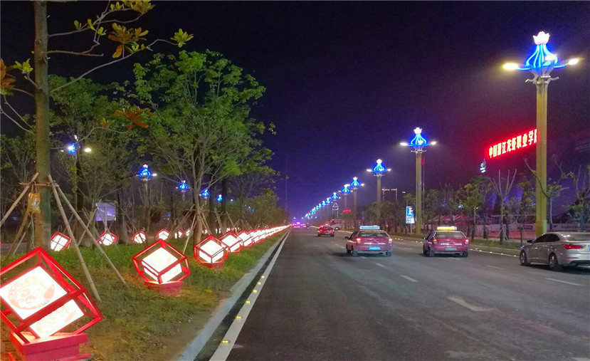 為豐富道路照明的夜間景觀效果,“群蝦迎客”屏風景觀燈和草坪燈安裝在了道路中間綠化帶,與“蝦戲荷塘”景觀路燈交相輝映,使道路照明的功能性與景觀性巧妙結合。