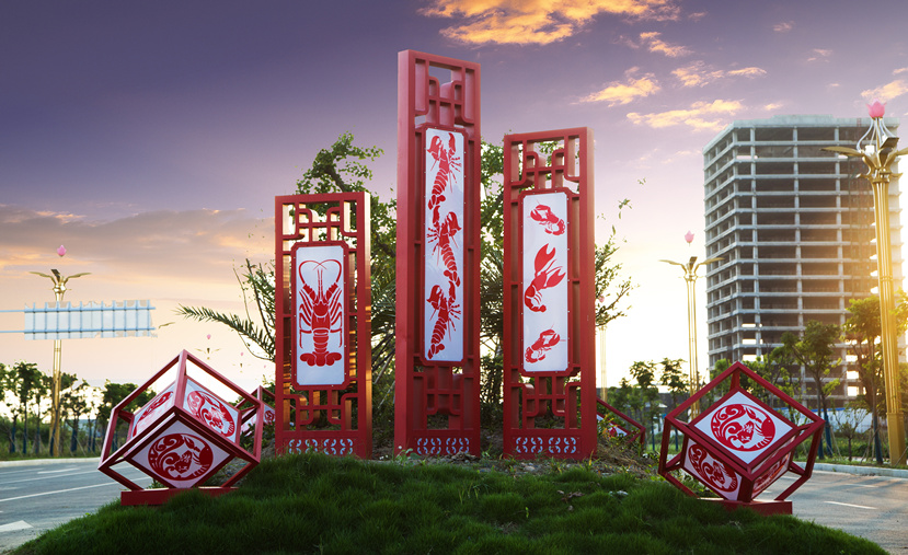 “群蝦迎客”屏風景觀燈高3米,寬1.8米,中部設有LED裝飾性光源。整燈以屏風為載體,采用小龍蝦的各種形態(tài)為表現(xiàn)手法,整體造型簡潔素雅展現(xiàn)出小龍蝦的活力。