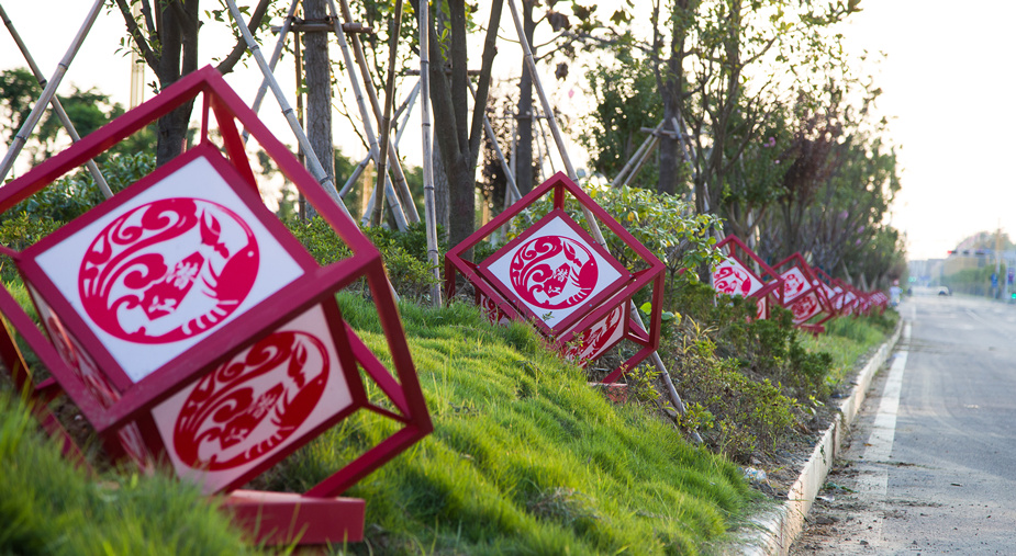 與屏風景觀燈配套的草坪燈也安裝在路段的綠化帶處,草坪燈上刻有以小龍蝦為元素的絲印圖案,處處突顯出“小龍蝦”作為潛江一張“活名片”的重要性。