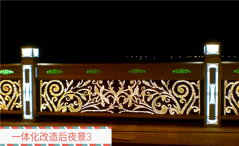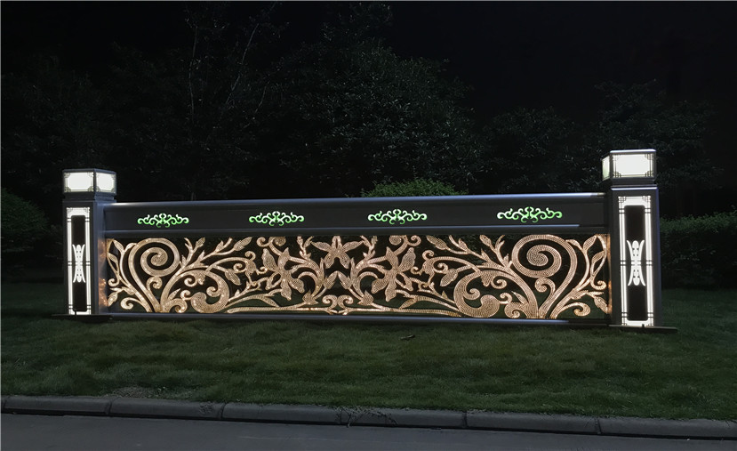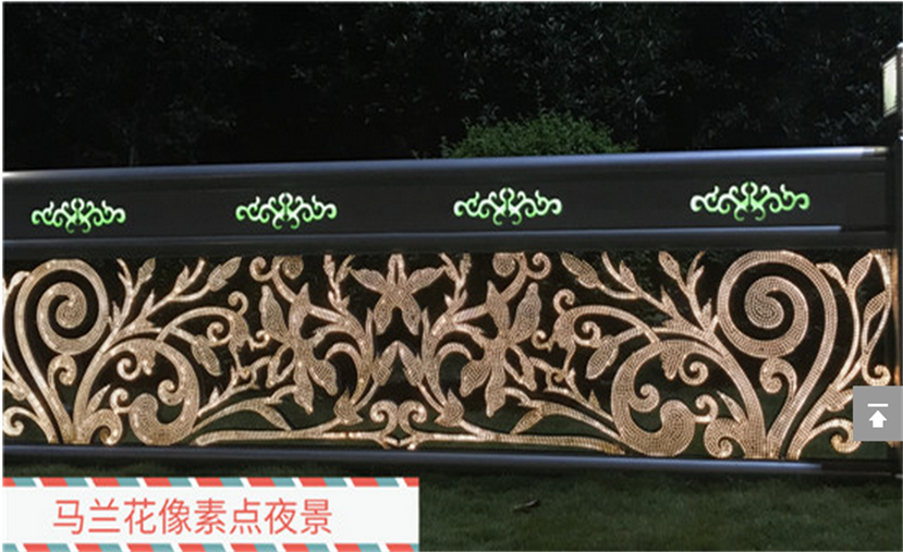 護欄體用不銹鋼材料雕刻、點焊成型。造型是鄂爾多斯市花馬蘭花。作品前后兩面激光切割三千個以上的小孔,作為出光像素點,內貼高目數不銹鋼防蟲網,腔體內根據造型曲線內埋LED軟燈帶,并用專業(yè)卡扣固定。護欄上部橫向鏤空四朵馬蘭花紋飾,并用帶色透明樹脂填充。