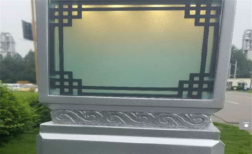 柱體前后兩面、柱頭四面用厚度足夠的磨砂玻璃實現內透,玻璃外以陽雕形式粘貼金屬雕刻件,腔內隱藏光源實現內透。