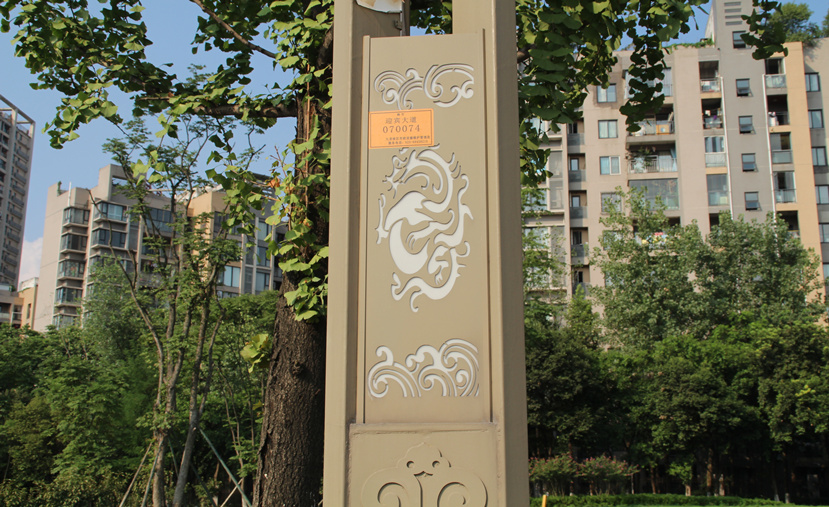 建立于春秋戰(zhàn)國時(shí)期的巴國以重慶為中心,創(chuàng)造了自己的文化,即巴文化,并且這種文化一直延續(xù)至今,成為連接古今巴文化的重要紐帶。設(shè)計(jì)者提取巴文化元素,在玉蘭燈底座采用巴文化花紋做浮雕。燈桿中部安裝兩個(gè)燈箱,上面的紋飾采用高新區(qū)和工業(yè)城的LOGO,并雕刻“高新九龍坡”和“百年工業(yè)城”的字樣紋飾。燈桿下部分雕刻龍紋紋飾,與地方方位名稱相得益彰,象征九龍坡。