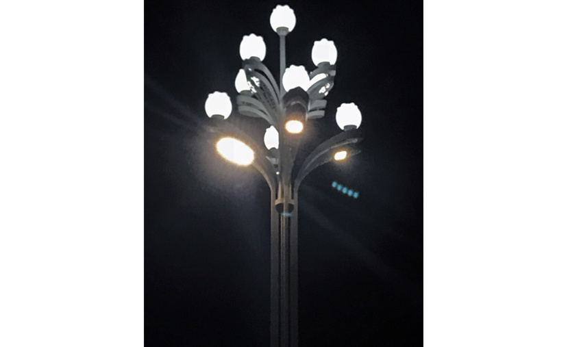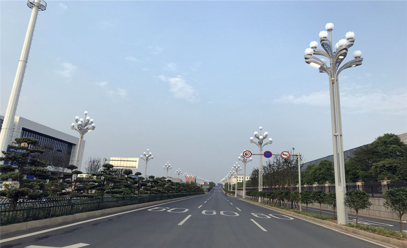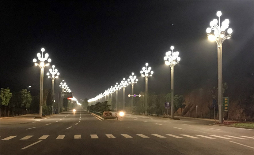 芙蓉?zé)舾?5.08米,燈型在滿足傳統(tǒng)道路照明的同時,燈頭頂部創(chuàng)造性地采用芙蓉花造型作為裝飾光源,給傳統(tǒng)的道路照明賦予景觀亮化功能,大大提升了高新大道的道路美觀程度。