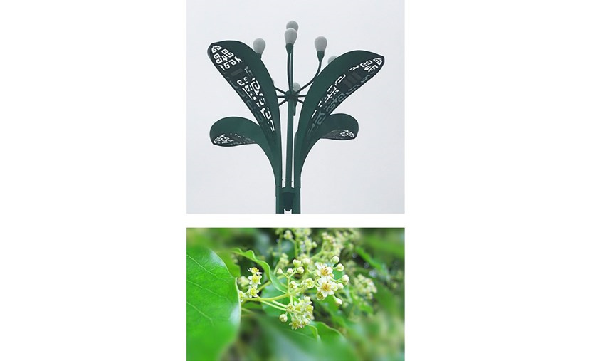 “香樟”景觀燈,根據(jù)祁陽(yáng)縣縣樹(shù)香樟的形狀進(jìn)行抽象設(shè)計(jì),通過(guò)燈臂部分展開(kāi)的樹(shù)葉和燈桿頂部即將盛開(kāi)的香樟樹(shù)花朵相結(jié)合,讓路燈集道路照明和景觀裝飾照明于一體,提升祁陽(yáng)夜間城市照明形象。
