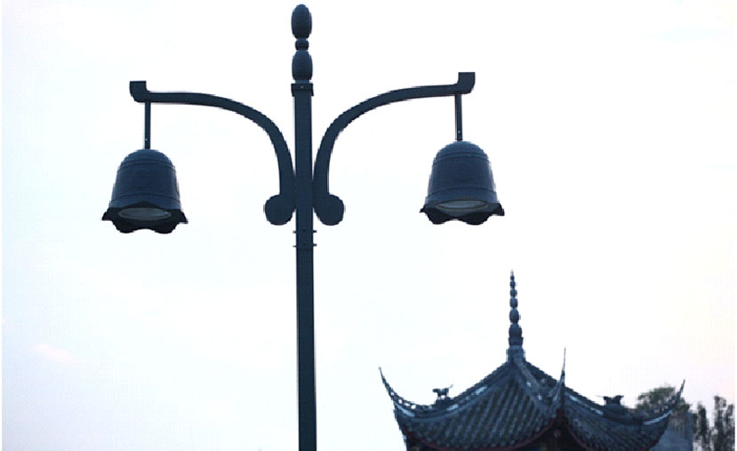 為了配合都江堰旅游富市戰(zhàn)略、體現并提升城市整體形象,四川華體照明科技股份有限公司在都江堰道路燈改造和提升項目中,根據都江堰“水”、“道家”、“歷史古建筑名城”等文化元素進行個性化設計了一款文化定制景觀燈——“古鐘燈”。