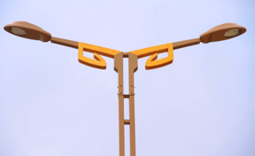 2014年,華體照明承接了廣元市區(qū)瓷蓮路蜀紋燈100盞。蜀紋燈,燈高12米,設(shè)計(jì)靈感源于古蜀文化中的青銅元素,雙臂造型,金色與黃色的銜接自然而美觀。桿體采用兩根矩桿連接而成,鏤空而通透。