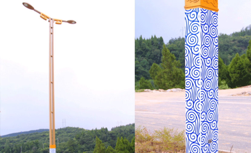該款燈底座將帶有中國(guó)元素的祥云紋運(yùn)用于燈具上,呈現(xiàn)藍(lán)白色相間,極具“中國(guó)風(fēng)”特色,寓意祥瑞、民安。燈桿與底座的連接部分,金色的卷云紋熠熠生輝,與底座的藍(lán)色對(duì)比鮮明,讓人眼前一亮。瓷蓮路完善了城市北環(huán)線,而蜀紋燈則如忠誠(chéng)的衛(wèi)士,排列有序,在迎接八面來賓的路上,訴說著廣元市古樸濃厚的歷史文化。