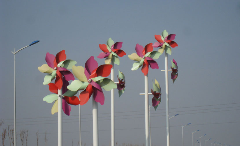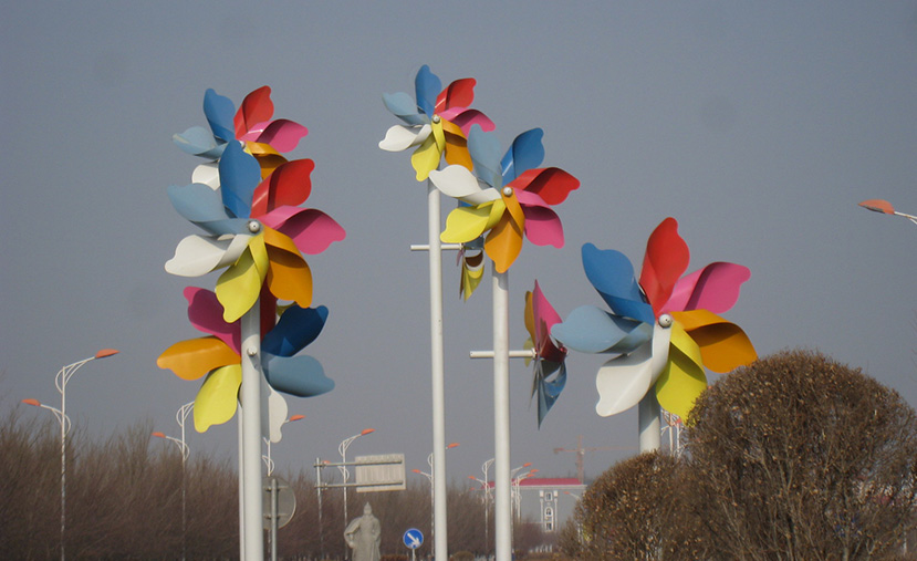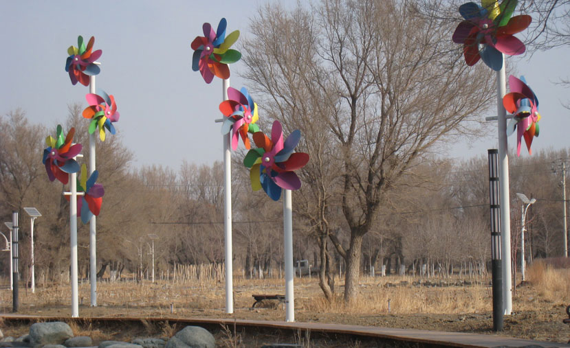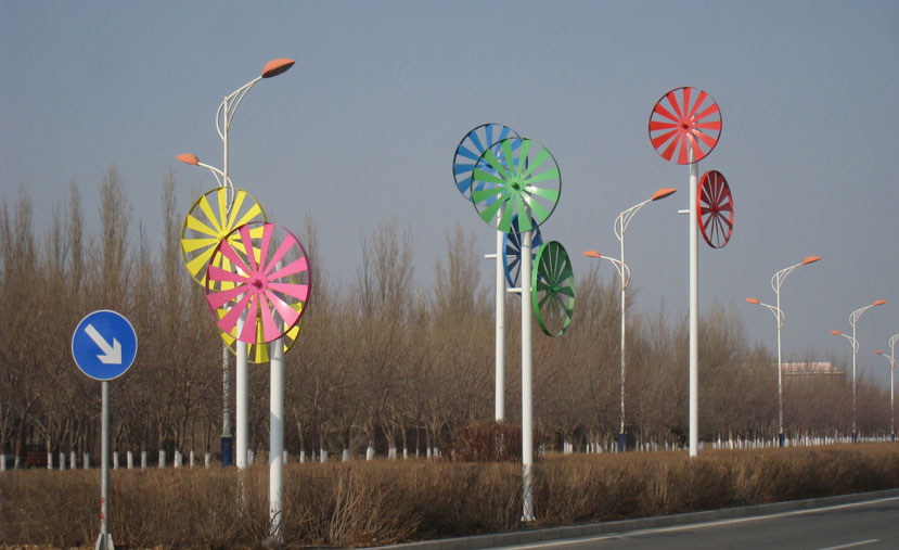 設(shè)計(jì)理念以風(fēng)車造型為創(chuàng)作元素,經(jīng)過設(shè)計(jì)者的提煉,設(shè)計(jì)為圓形風(fēng)車和四葉風(fēng)車兩種。葉片根據(jù)風(fēng)力學(xué)進(jìn)行設(shè)計(jì),可隨風(fēng)轉(zhuǎn)動(dòng),具有生命力。本項(xiàng)目中共運(yùn)用了五柱景觀風(fēng)車,安裝在達(dá)坂城洛賓路。
