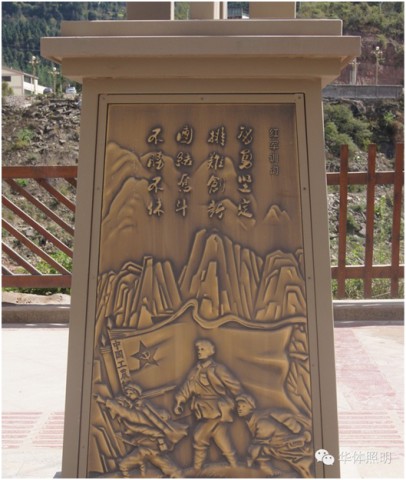 燈體底座采用了紅色文化設(shè)計(jì)元素,進(jìn)行銅板雕刻紅軍抗戰(zhàn)形態(tài),燈底長(zhǎng)城紋理表面更具歷史厚重感。整燈玉蘭花的植物造型呼應(yīng)該城生態(tài)化特征主題,為“景城一體”的目標(biāo)出力。