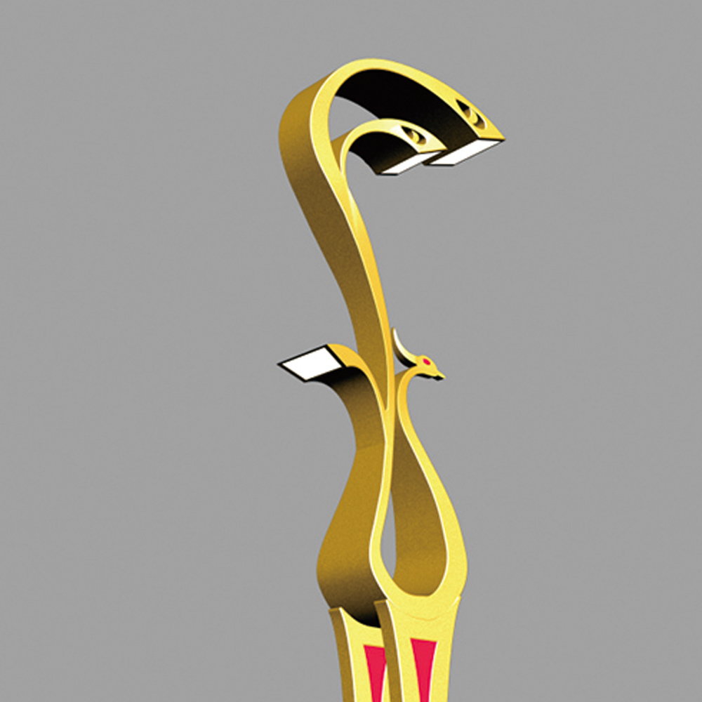 燈型上部為鳳凰的流線簡(jiǎn)化樣式,桿體采用夸張的手法表現(xiàn)鳳凰的腳腿,底座用強(qiáng)烈的對(duì)比方式,以藍(lán)、白相間的“祥云”紋飾來表現(xiàn)鳳舞九天的藝術(shù)效果;