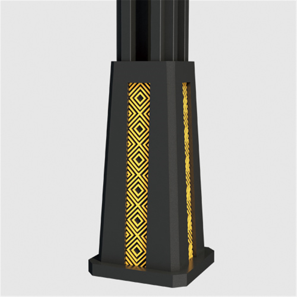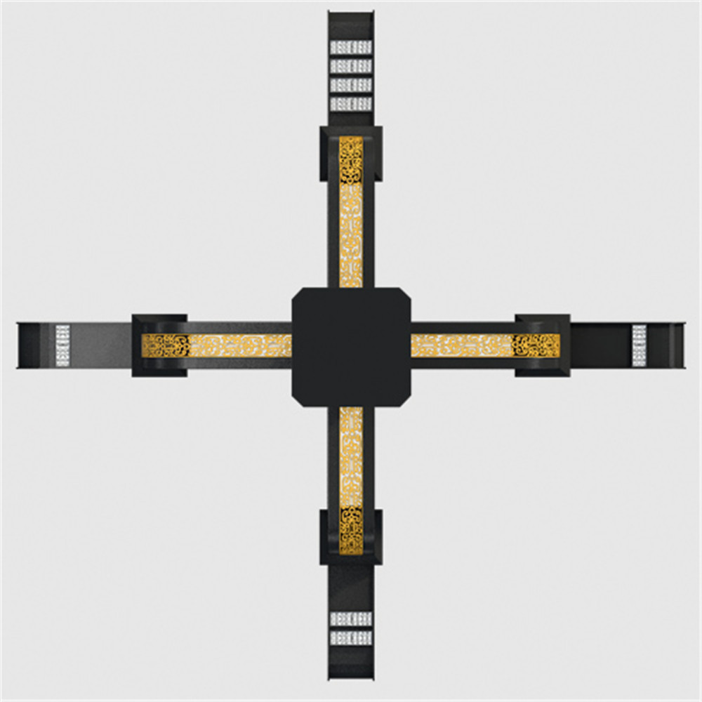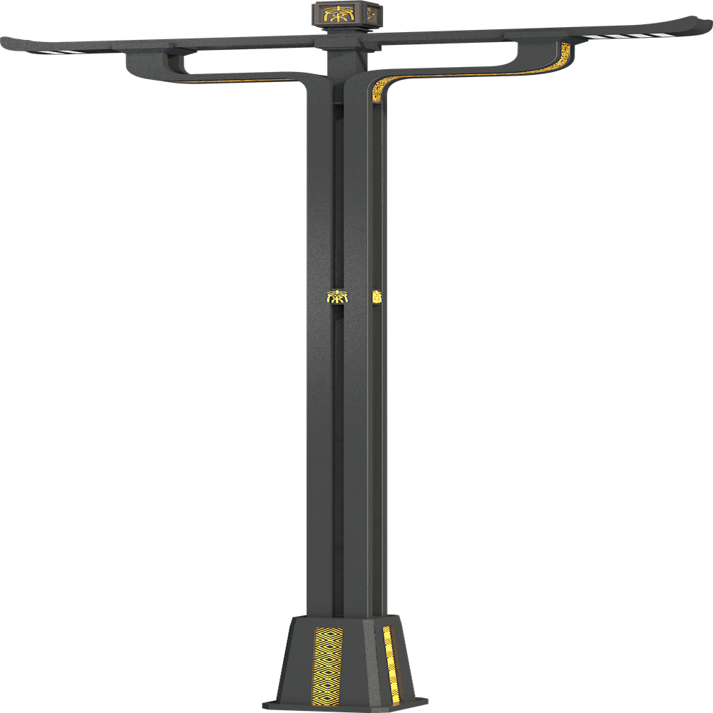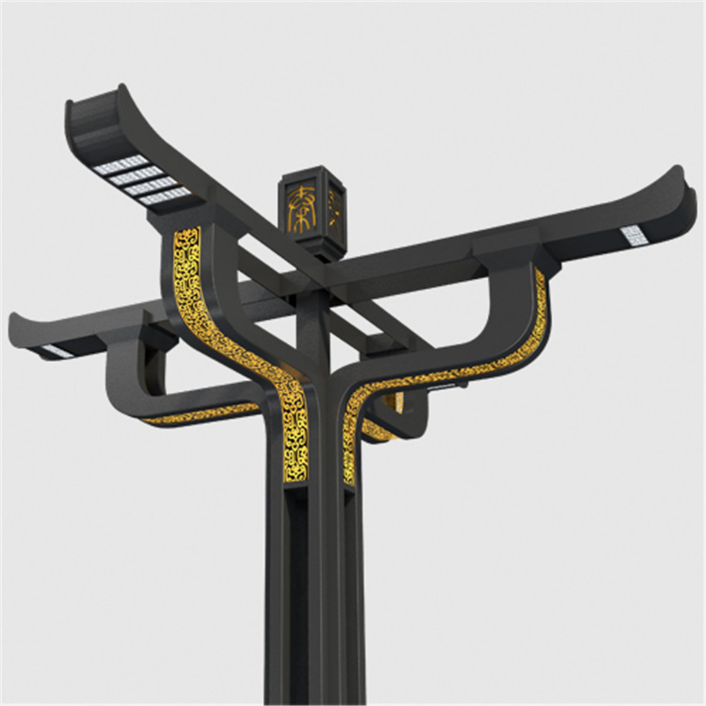 設(shè)計(jì)以秦漢建筑為元素,取秦代崇尚的黑色為主色調(diào),燈臂裝飾以秦代紋飾,造型則提取自漢斗、漢闕。線(xiàn)條流暢、簡(jiǎn)練,四向?qū)ΨQ(chēng)的造型莊重大氣。
