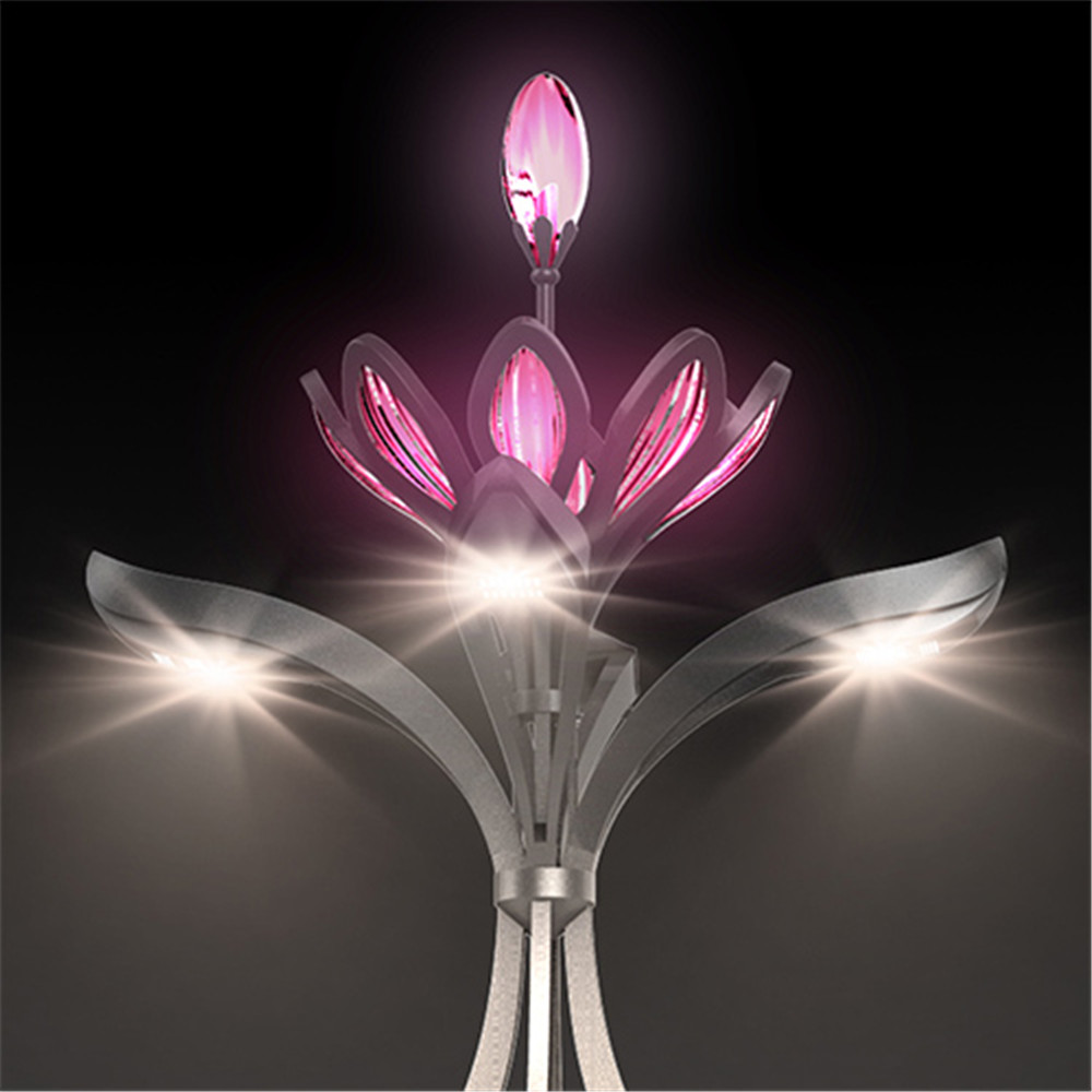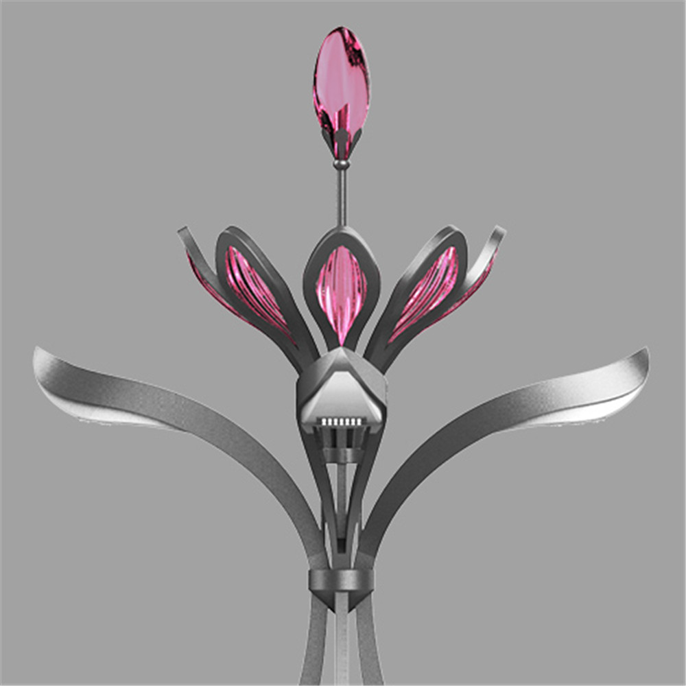 采用山茶花作為設(shè)計(jì)元素,燈桿設(shè)計(jì)成四桿花瓶狀,打破常規(guī)燈桿單一的樣式,主體分為功能照明和裝飾照明兩個(gè)部分,分別對(duì)應(yīng)的是山茶花的葉子、花瓣和花蕾,彩色的裝飾玻罩白天具備一定景觀性,和道路綠化景觀的“四季有花賞”的設(shè)計(jì)策略相融合,夜晚呈現(xiàn)山茶花盛世開(kāi)放的亮麗景致。